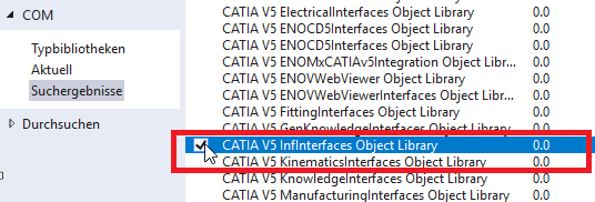 Als Minimum muss die Library „InfInterfaces“ ausgewählt werden. Je nachdem welche Funktionen der V5Automation API für die Applikation verwendet werden sollen, müssen weitere COM-Schnittstellen referenziert werden.