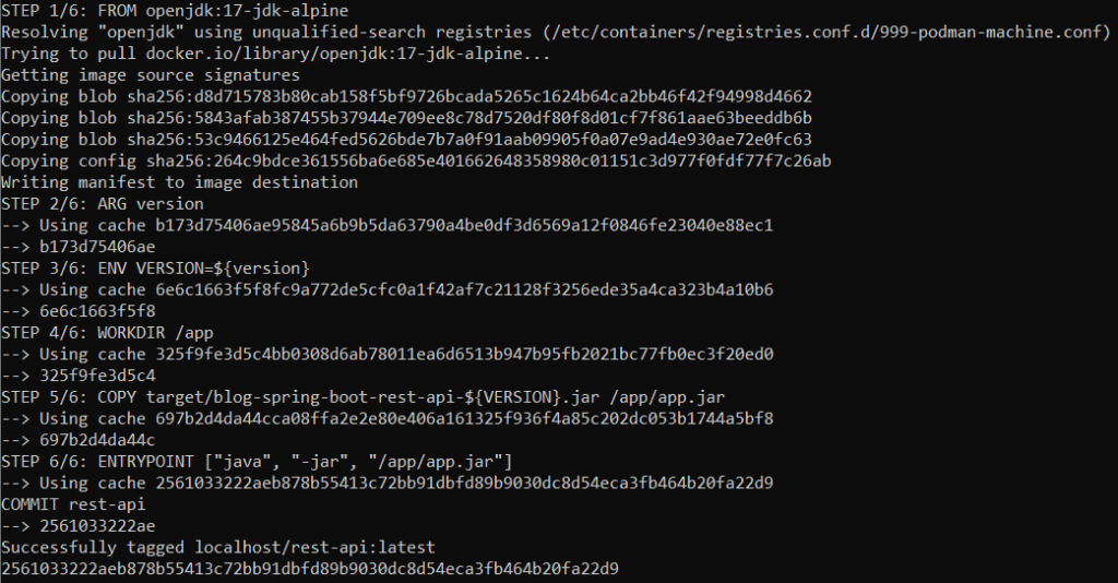 FROM openjdk:17-jdk-alpine<br>ARG version<br>ENV VERSION=${version}<br>WORKDIR /app<br>COPY target/blog-spring-boot-rest-api-${VERSION}.jar /app/app.jar<br>ENTRYPOINT ["java", "-jar", "/app/app.jar"]