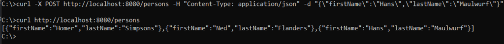 curl -X POST http://localhost:8080/persons -H "Content-Type: application/json" -d "{\"firstName\":\"Hans\",\"lastName\":\"Maulwurf\"}"